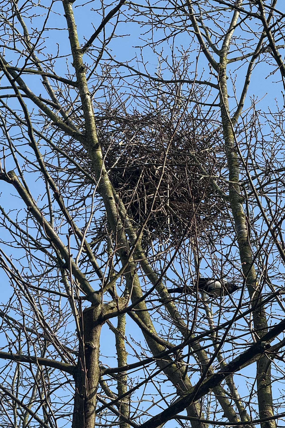 Bei Herrn Buddenbohm nisten die Elstern und hier vor meinem Balkon passiert etwas ganz ähnliches. Im gleichen Baum wollten zwei Tauben wie jedes Jahr ihr Nest bauen, entschlossen sich jedoch das halbfertige Nest in einen Busch auf der anderen Straßenseite zu verlegen. Auf die Nachbarschaft, die ihnen im letzten Jahr mehr als einmal die Eier geklaut hat, können sie dann doch verzichten.